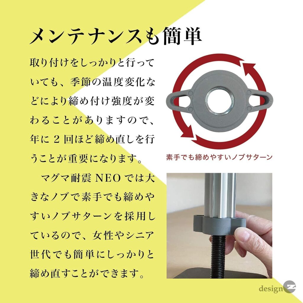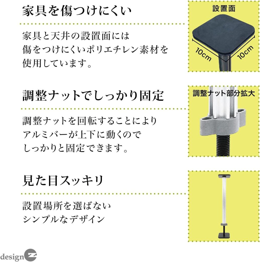 天井と家具を突っ張る際のねじ込みのとってが大きくて回しやすいため、初めて設置する際やメンテナンスの時に回しやすいです。