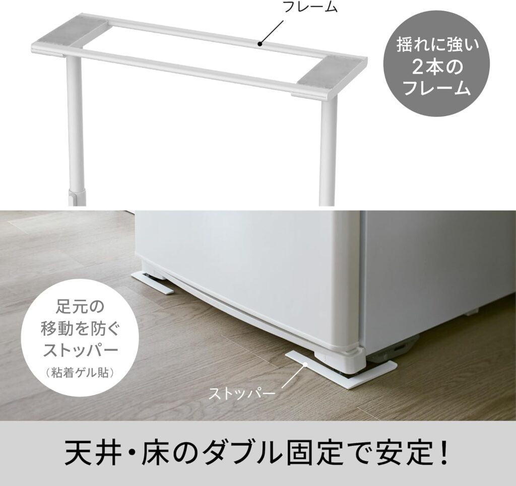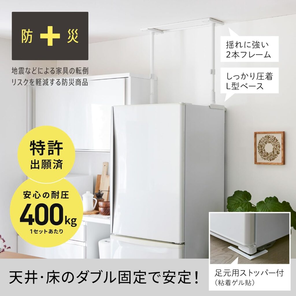 平安伸銅工業FEQシリーズは、冷蔵庫専用の”転倒防止突っ張り棒”で、天井にはフレーム付きの突っ張り棒、床面にはストッパーを装着して冷蔵庫を強力に固定します。