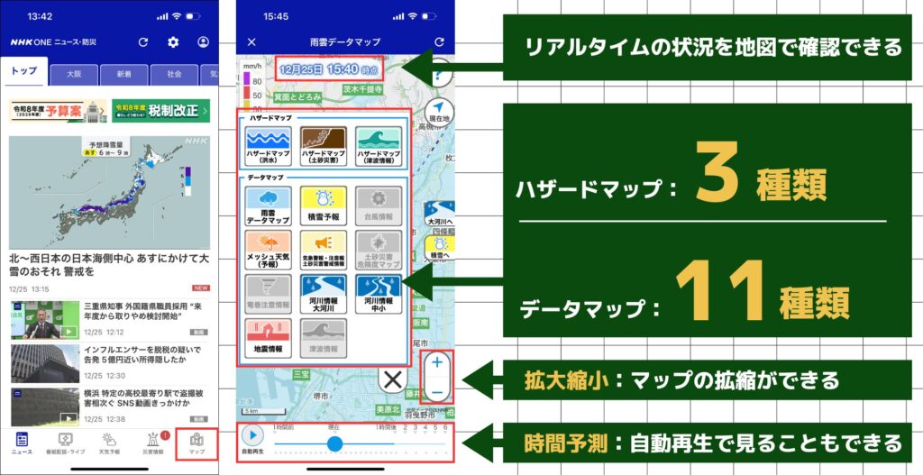 以下の機能は全て無料で使用できる「NHK ONE ニュース防災アプリ」の機能になります。日常から緊急時まで使える機能が豊富に搭載されています。