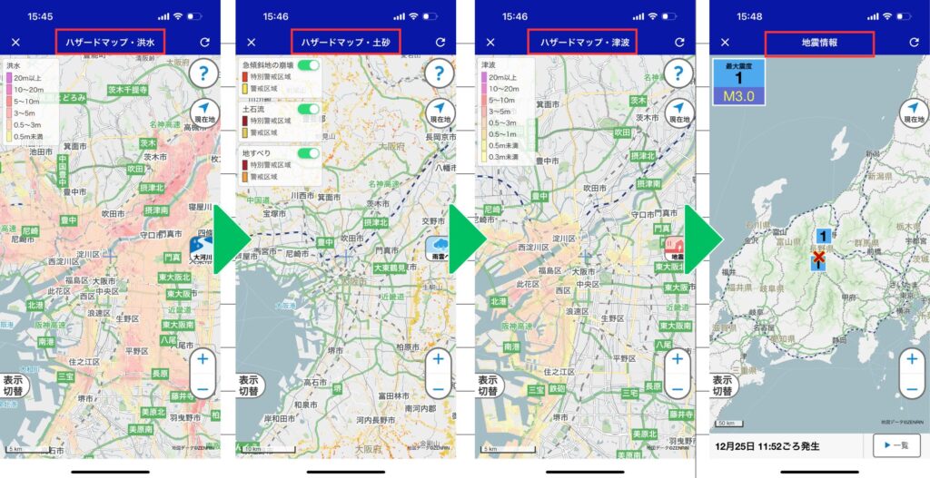 この「マップ」メニューでは、ボタン一つで各種ハザードマップを確認することができる為、手間がかからず、楽に情報を取得することができます。
