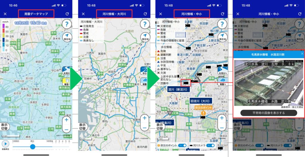 また、河川情報では、現地のカメラ情報を確認することができます。ライブカメラを確認することによって、洪水や大雨の際に、河川の氾濫状況をリアルに確認することができます。