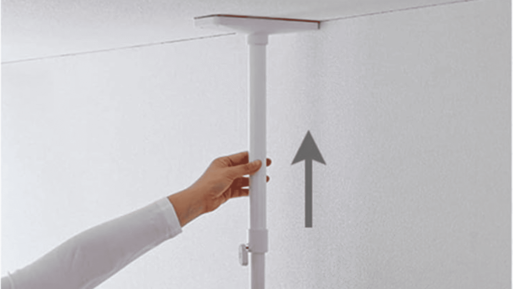 2本のパイプを連結し、上下に抑えプレートを差し込んで装着します。家具の天井に置き、抑えプレートを天井まで伸ばし、届いたところでネジを固定します。天井までピッタリである必要はありませんが、可能な限り隙間なく固定しましょう。その後に圧着ハンドルを回すとパイプが伸びてがっちり固定することができます。取り付けた後は、ゆるみや隙間がないか軽く揺らして確認してください。