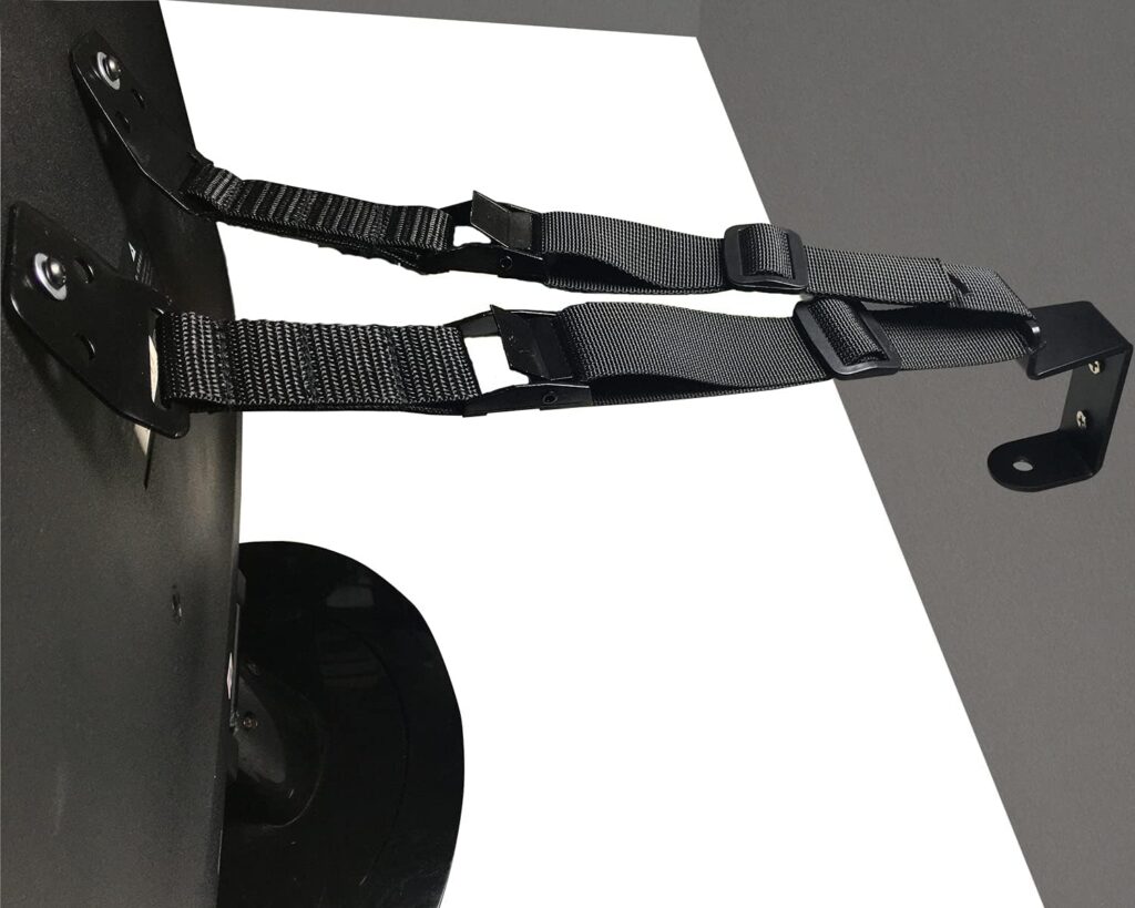 転倒防止グッズの中には、ベルトを1か所で固定しているものがありますが、基本的には、2か所で固定するものを選びましょう。2か所止めの方が、より大きな震度にも耐えられるようになっています。逆に、ベルト固定が1か所だと、固定箇所を支点に、地震の揺れに合わせてテレビが大きく振り子のように動くため、危険が伴います。できれば、2か所止めのグッズを選ぶ方が良いでしょう。