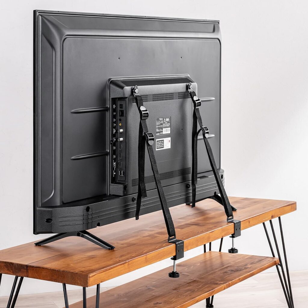 特に人気な固定方法として、クランプ止めという方法があります。クランプ止めとは、テレビボードの天板を挟み込むようにして、ベルトを装着する方法です。他の取り付け方法と比べ、テレビボードや壁に傷をつける心配がなく、なおかつ強力に固定できるため、人気の高い固定方法となっています。