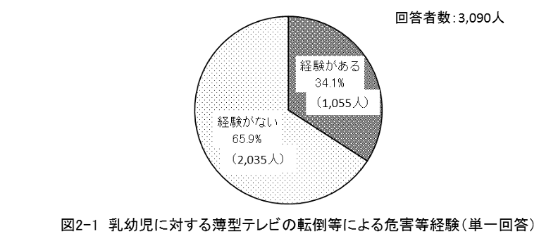 国民生活センターが実施した1歳〜5歳の子どもの保護者を対象にしたアンケートで、子供がテレビを転倒させた際の、ヒヤリハットの経験があると答えた人は34.1%と回答がありました。
