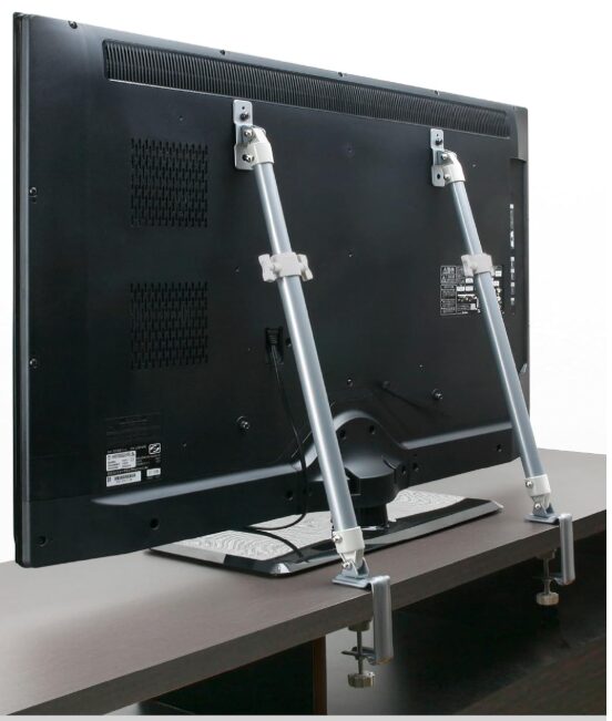 固定には、粘着シートやネジ止め、テレビボードを挟み込んで固定するクランプ式があります。また、テレビ側には、世界共通のVESA規格というネジ穴がついている製品が多く、その穴を利用してベルトやワイヤーを固定します。