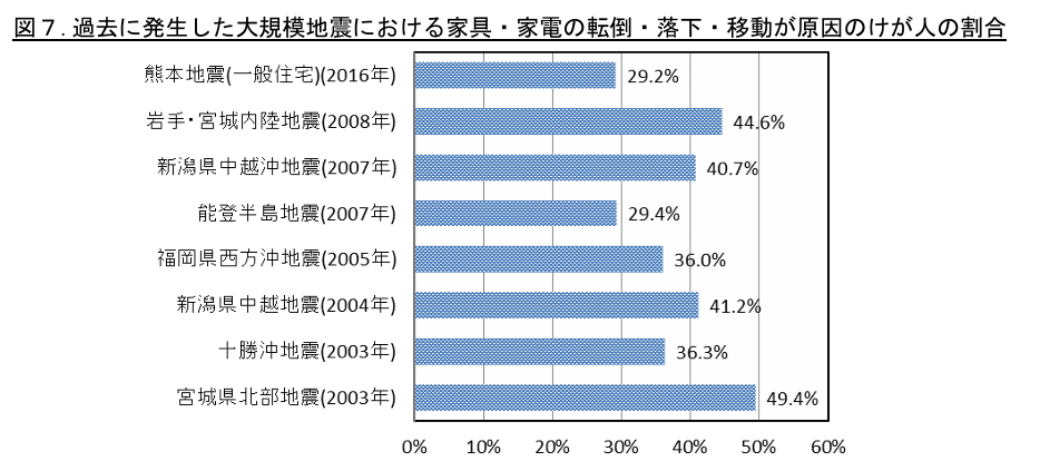 過去に発生した大規模地震に関する調査によると、地震に関するけがをした原因について、約30~50%の人が、家具・家電の転倒・落下・移動によるものという回答があります。また、グラフには記載されていませんが、阪神淡路大震災では、亡くなった方の約8割が家具・家電の転倒や下敷きによって命を落としています。